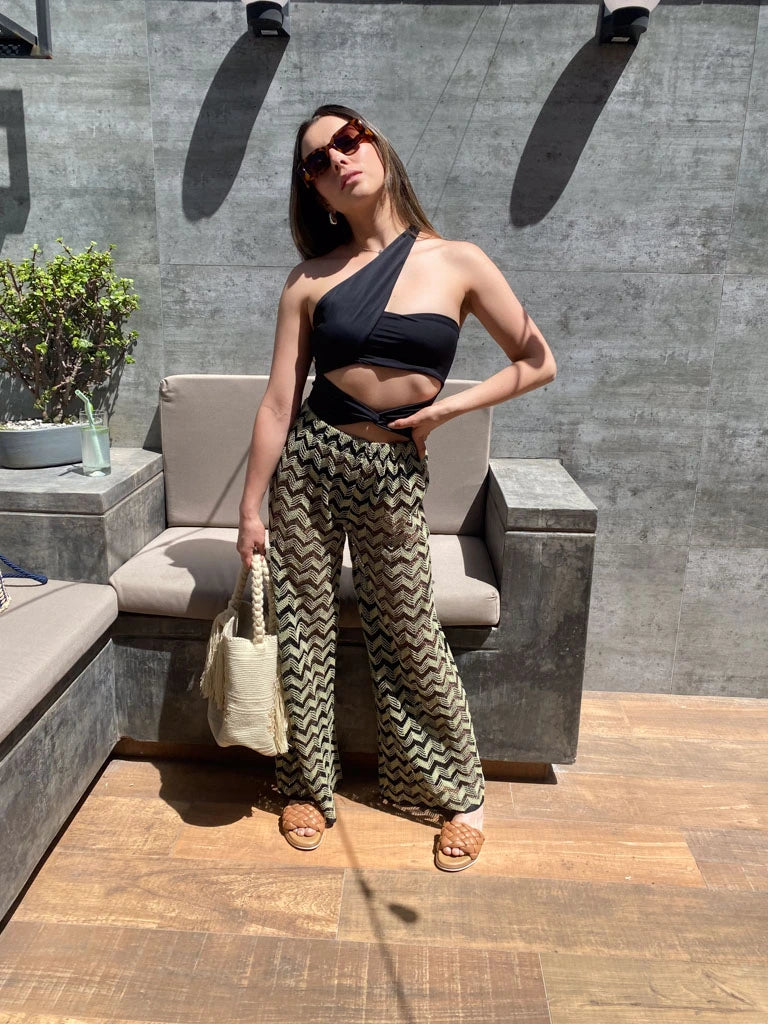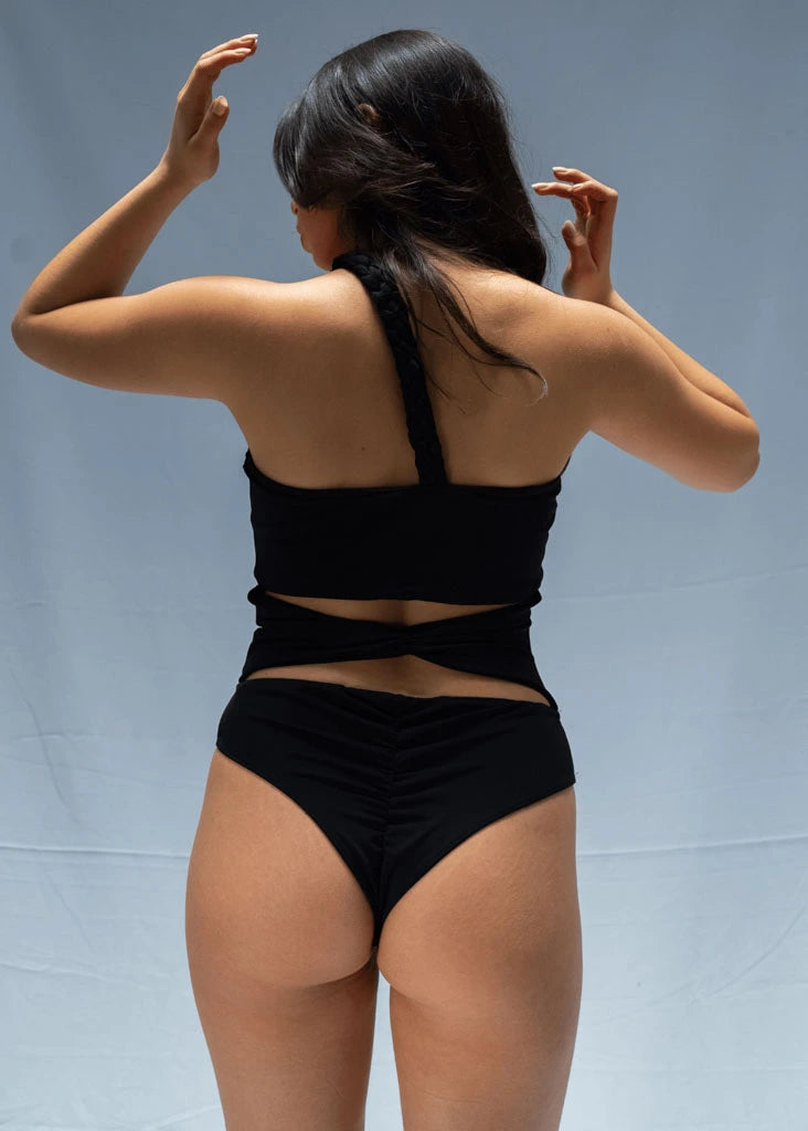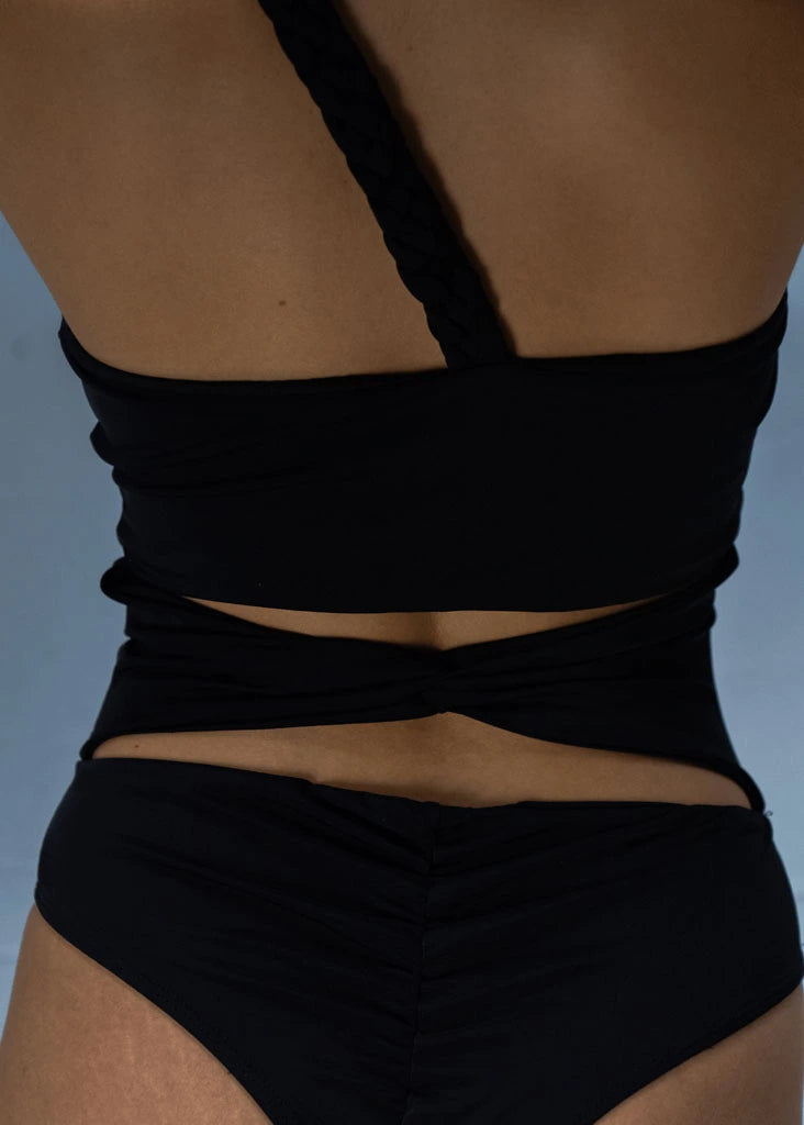 Un diseño asimétrico y vanguardista con aberturas estratégicas que realzan la figura. La tira del hombro se convierte en una trenza en la espalda, agregando un detalle sofisticado, además esta también la puedes "esconder" en el top, y te quedara un vestido de baño/body strapless. La tira del abdomen tiene un nudo para realzar la cintura. Su tono negro lo hace elegante y fácil de combinar, ya sea para un día en la playa o para usar como body.