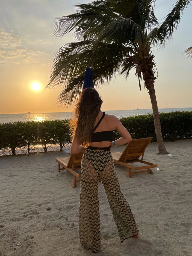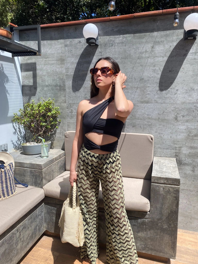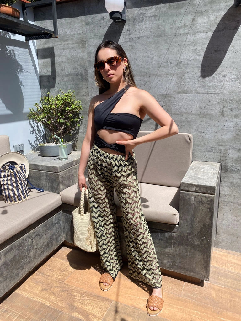 Pantalón tejido con diseño zigzag en tonos verdes y negros, ideal para playa, día a día o festivales. Su caída ligera y transparencias sutiles aportan un look bohemio, fresco y sofisticado. Tiene caida bota campana, lo cual resalta un montón tus piernas y te hace ver mas alargada.